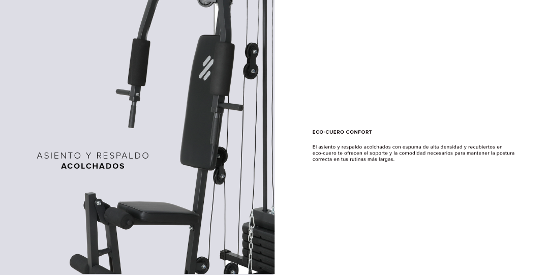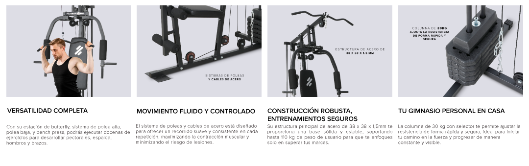 Su columna de carga de 30 kg es perfecta para tonificar tu musculatura y progresar a tu ritmo, todo sobre una robusta estructura de acero que garantiza estabilidad y seguridad en cada repetición. Es la solución todo-en-uno definitiva para construir la mejor versión de ti mismo sin salir de casa
