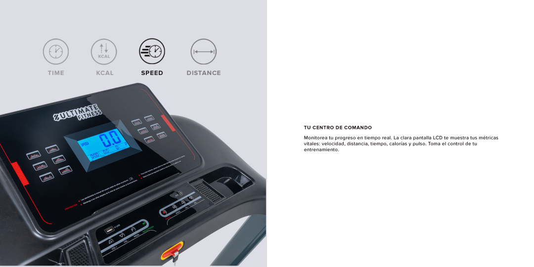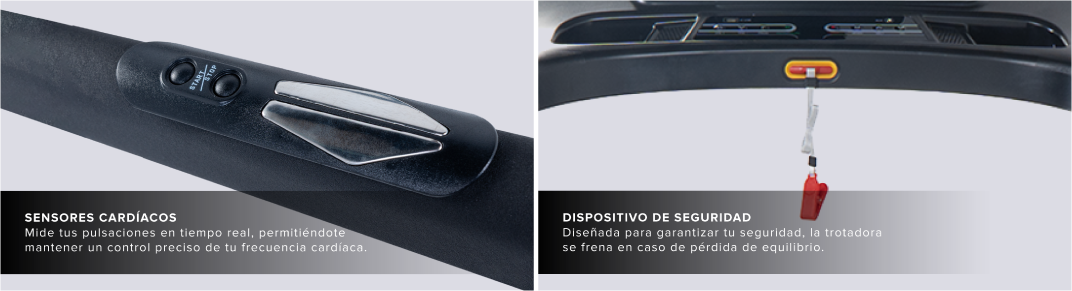 - Pantalla LCD: indicador de frecuencia cardiaca, velocidad, distancia, tiempo y calorías.