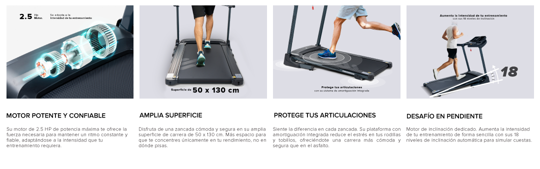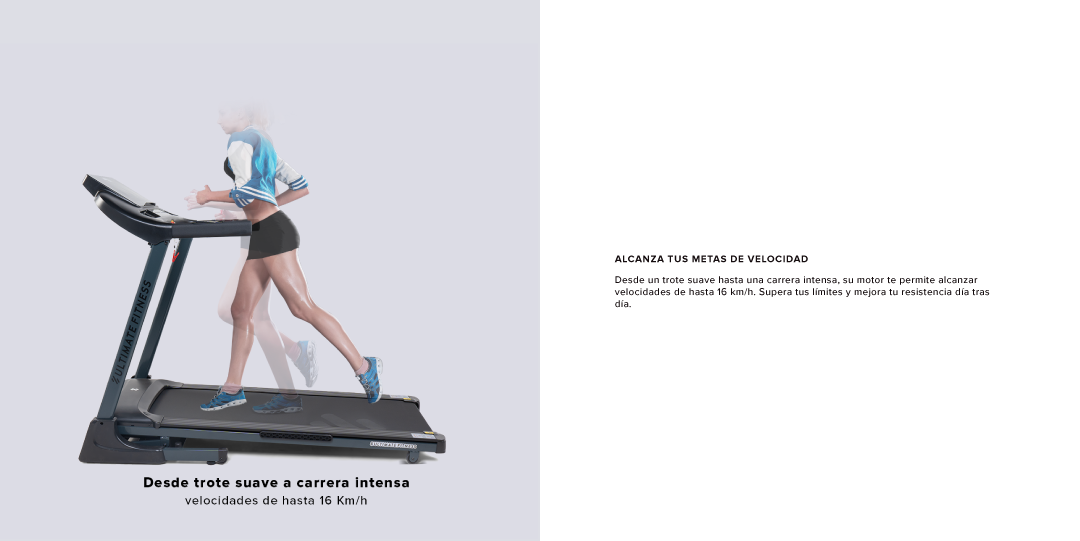 Lleva tus entrenamientos al siguiente nivel con la nueva versión mejorada de última generación. Su motor extra potente y su amplia plataforma te ofrecen la estabilidad y el espacio que necesitas para correr sin restricciones, mientras cambias la inclinación para intensificar cada zancada.