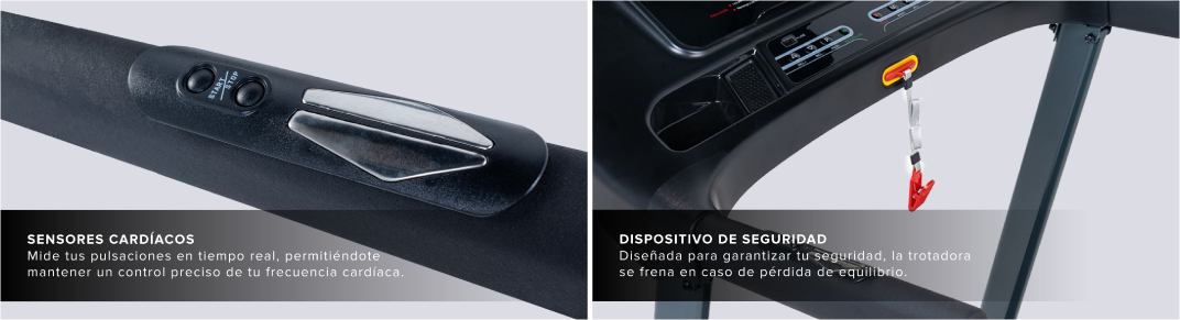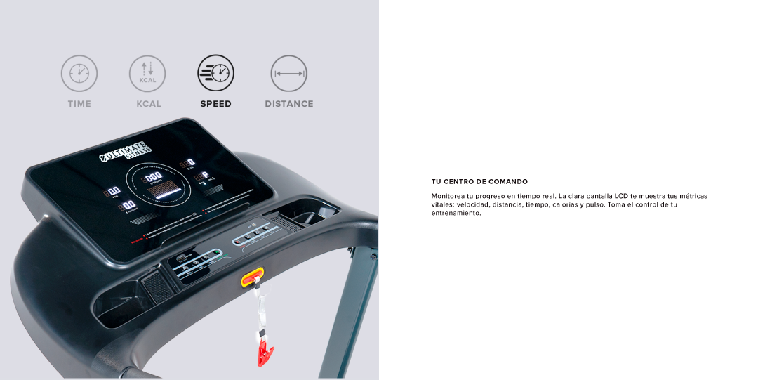 - Pantalla LED: indicador de frecuencia cardiaca, velocidad, distancia, tiempo y calorías.